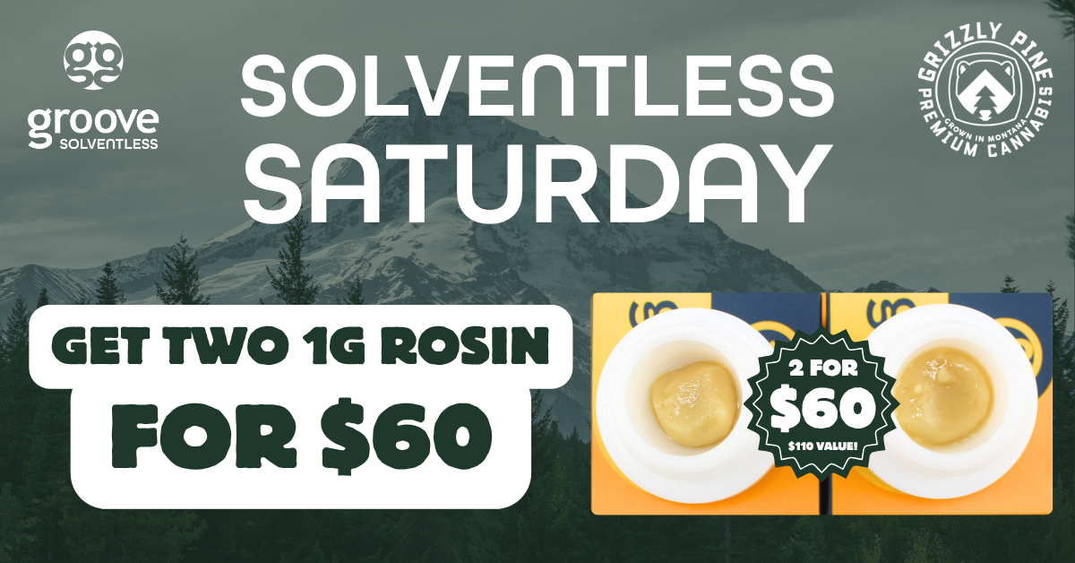 Quick Rip: Solventless Saturdays start now at Grizzly Pine. Grab 2 grams of Groove Live Rosin for $60 (normally $110). Every Saturday, all locations.
