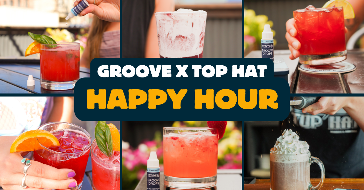 Stop by Groove, located above the Top Hat, between 3–6pm to get 30% off Groove Drops, our THC beverage enhancer. You’ll also receive a coaster from our budtenders to claim a free mocktail at the Top Hat Lounge—the perfect base to add your Groove Drops and enjoy the full experience.