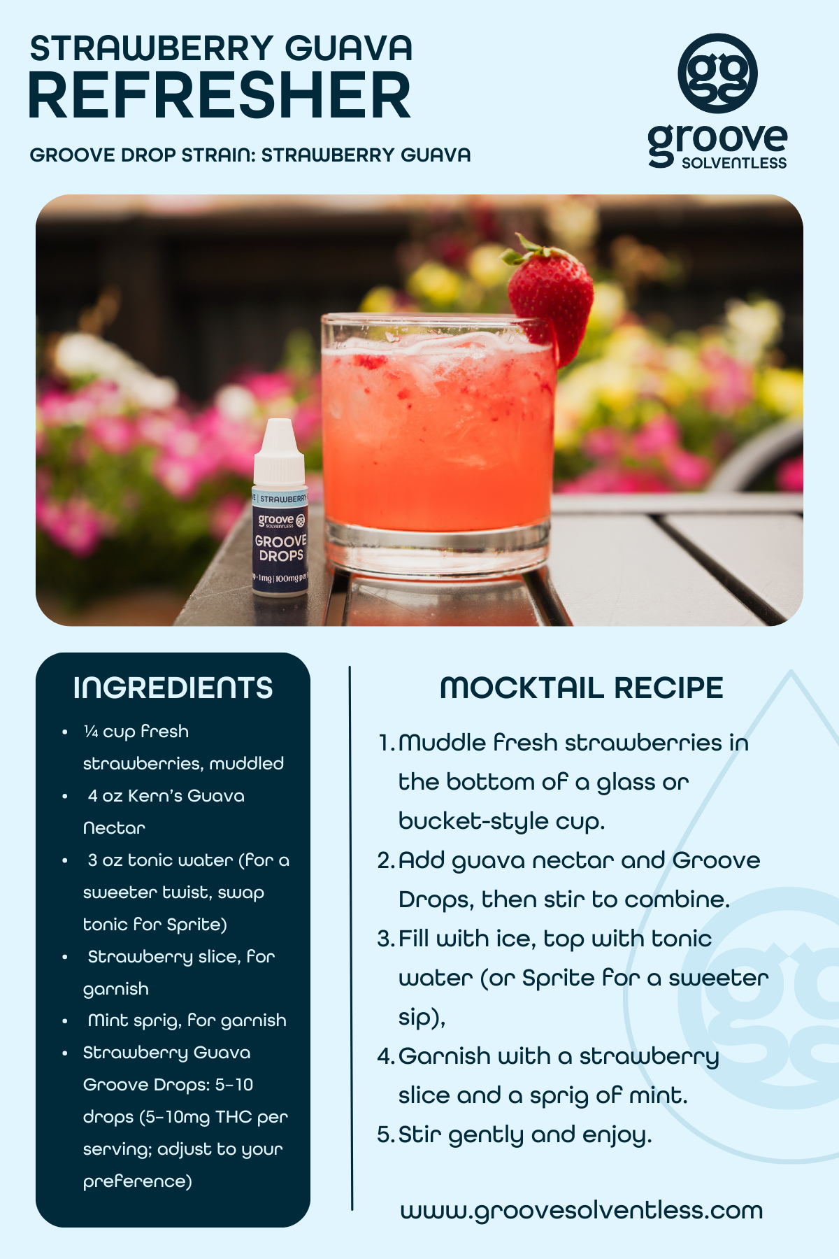 Directions: Muddle fresh strawberries in the bottom of a glass or bucket-style cup. Add guava nectar and Groove Drops, then stir to combine. Fill with ice, top with tonic water (or Sprite for a sweeter sip), Garnish with a strawberry slice and a sprig of mint. Stir gently and enjoy.